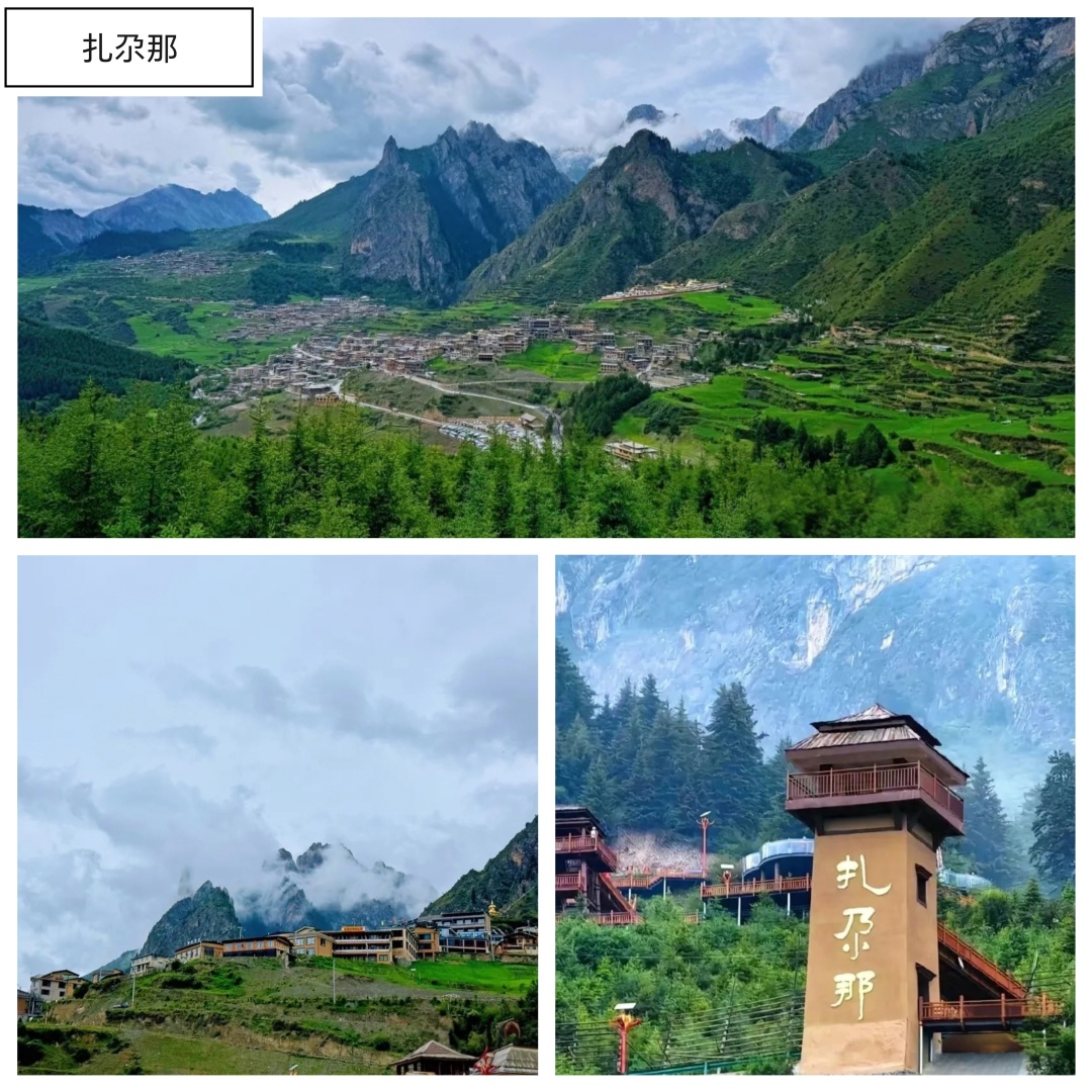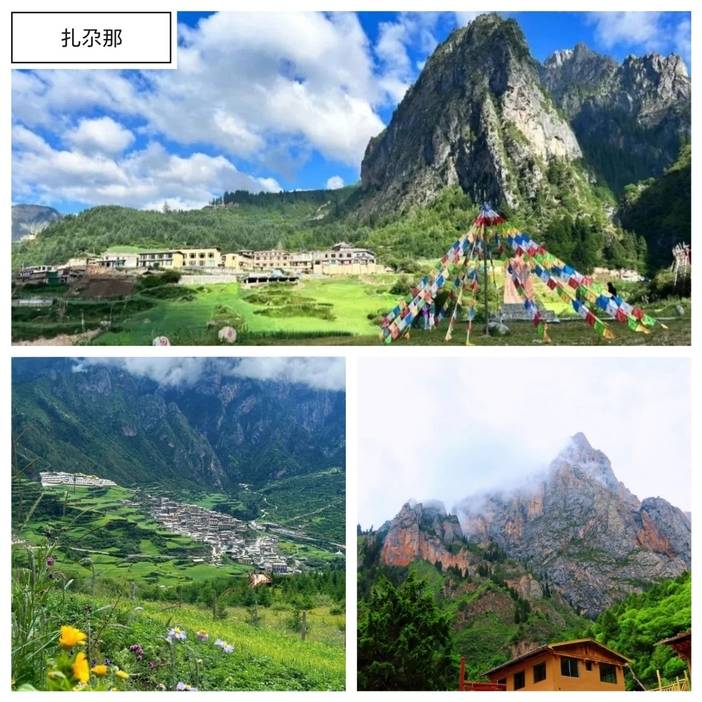 扎尕那:是一座完整的天然“石城”,俗有“阎王殿”之称。地形既像一座规模宏大的巨型宫殿,又似天然岩壁构筑的一座完整的古城。正北是巍峨恢弘、雄伟壮观、璀璨生辉的光盖山石峰,古称“石镜山”,因灰白色岩石易反光而有其名;东边耸峙壁立的俊俏岩壁,凌空入云,云雾缭绕;南边两座石峰拔地而起,相峙并立成石门;再南至东哇、纳加一带,峭壁矗立,清流跌宕,水磨飞轮,流转不息。山势奇峻、景色优美,犹如一座规模宏大的石头宫殿,这片世外桃源虽然早在近百年前就被洛克誉为亚当和夏娃的诞生地,但至今仍是一块处女地。