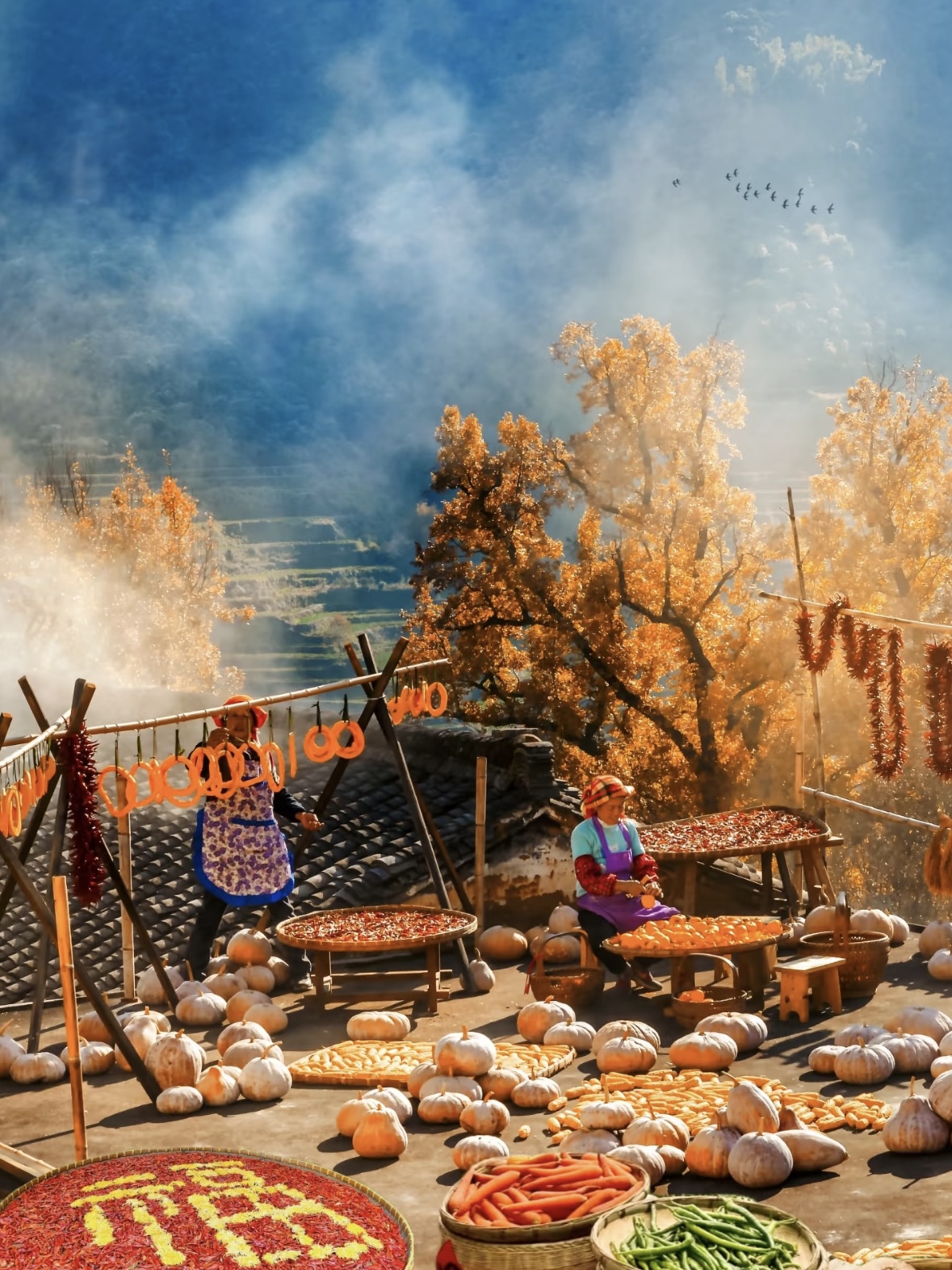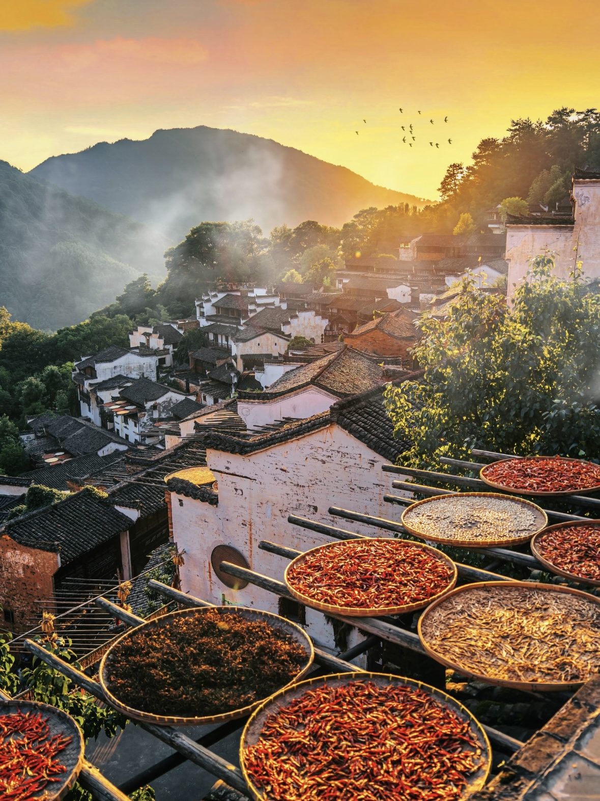这是篁岭独有的烟火盛景,来到晒秋人家观景台晒匾里的辣椒、玉米等五彩作物与金黄油菜花相映成趣,出片率超高。